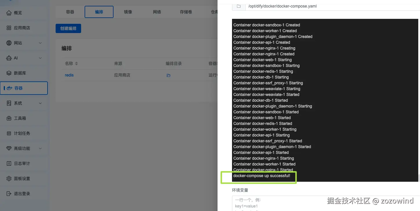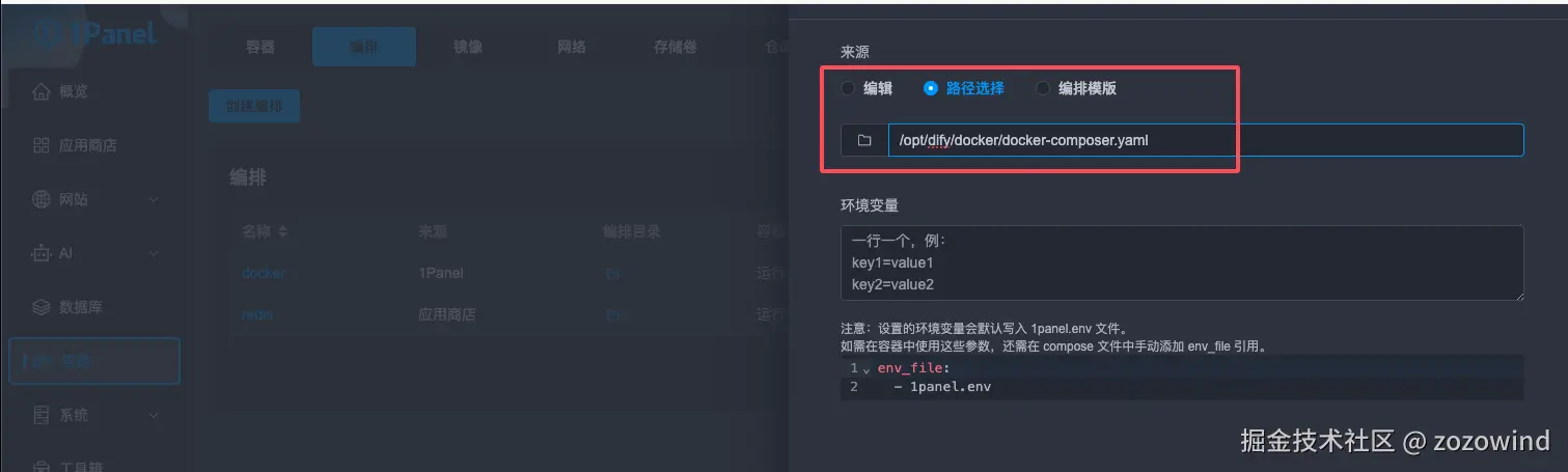1Panel控制台->容器->编排点击创建编排 - 来源选择填写路径选择,并填写上传文件夹docker-composer.yaml的地址, 如:/opt/dify/docker/docker-composer.yaml