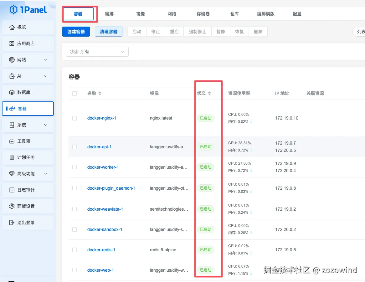 1Panel控制台->容器确定所有的容器都正常启动