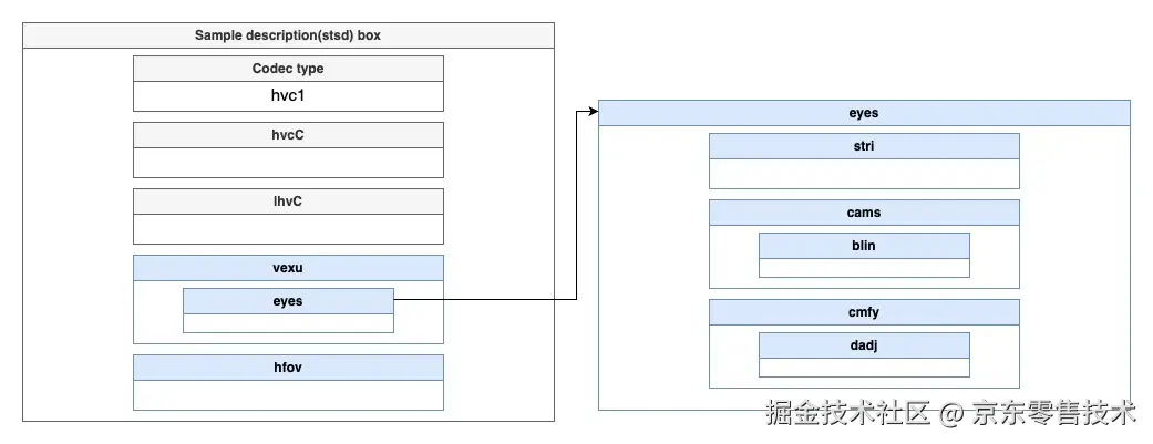 - 增加苹果自定义信息vexu、hfov,用于描述自定义信息,其数据结构如图12所示,其中关键字段有:blin:定义baseline,表示相机基线,以实际数值的1000倍来记录,例如Vision Pro的63.54mm记录为63540。dadj:定义disparity,表示水平视差调整,以实际数值的10000倍来记录,例如Vision Pro的2.93%记录为293。hfov:表示水平视场角,以实际数值的1000倍来记录,例如Vision Pro的71.59度记录为71590。
