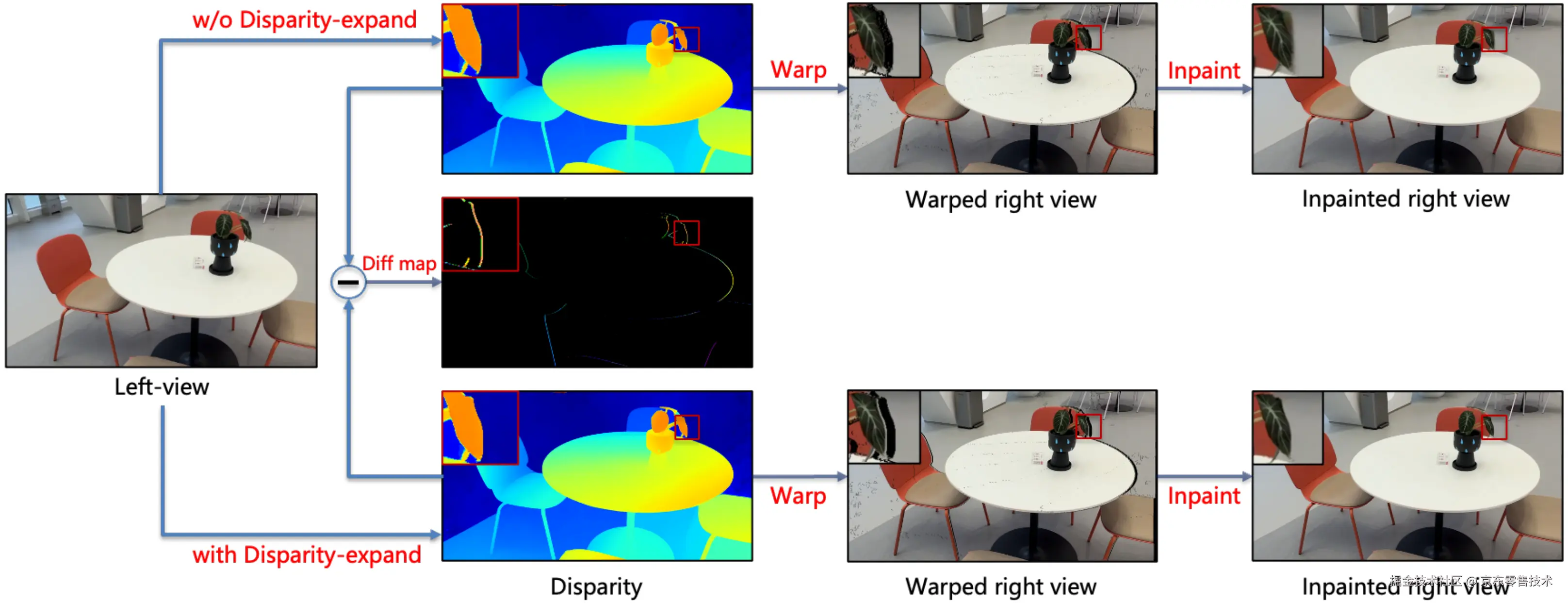 新视角合成是视觉领域中的一项关键任务,其目标是在有限的视图基础上生成场景或物体的其他视角。这项技术在虚拟现实、增强现实、电影特效和游戏开发等领域具有广泛应用。尽管基于NeRF、3DGS和Diffusion的方法近年来取得了显著进展,但仍面临诸多挑战。例如,NeRF和3DGS方法通常只能针对单一场景进行建模,而扩散模型在生成视频时难以保证稳定性和一致性。在分析任务的特殊需求时,我们发现只需生成固定姿态的右眼视角图像,且场景具有位移小、丰富多样以及视频稳定性和一致性要求高等特点。基于这些考虑,我们最终选择采用深度Warp和空洞区域填充InPaint的方法来完成新视角合成任务。