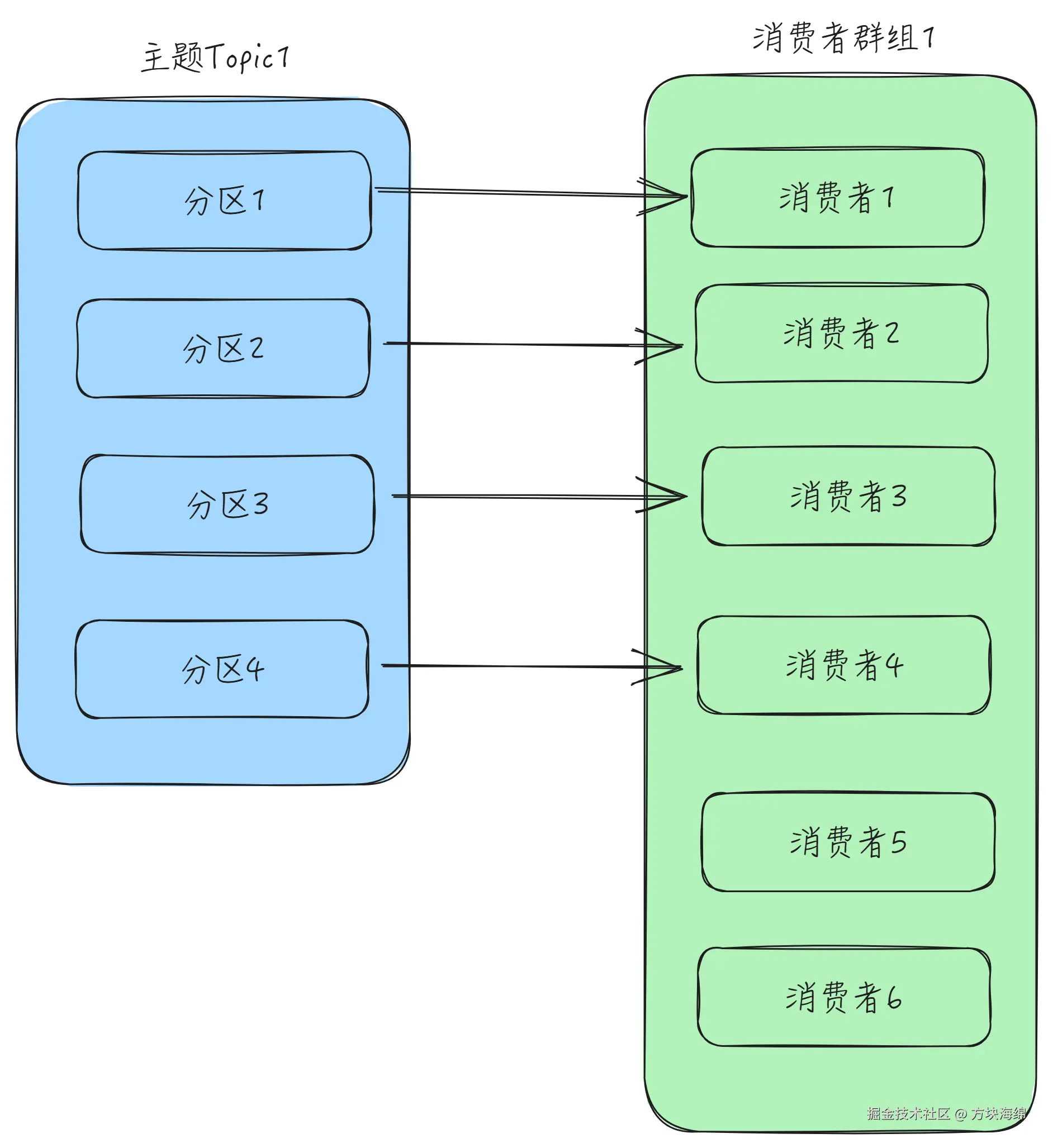水平拓展提升消费能力。这也是为什么建议创建主题时使用比较多的分区数。另外,消费者的数量不应该比分区数多,因为多出来的消费者是空闲的,没有任何帮助。