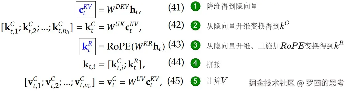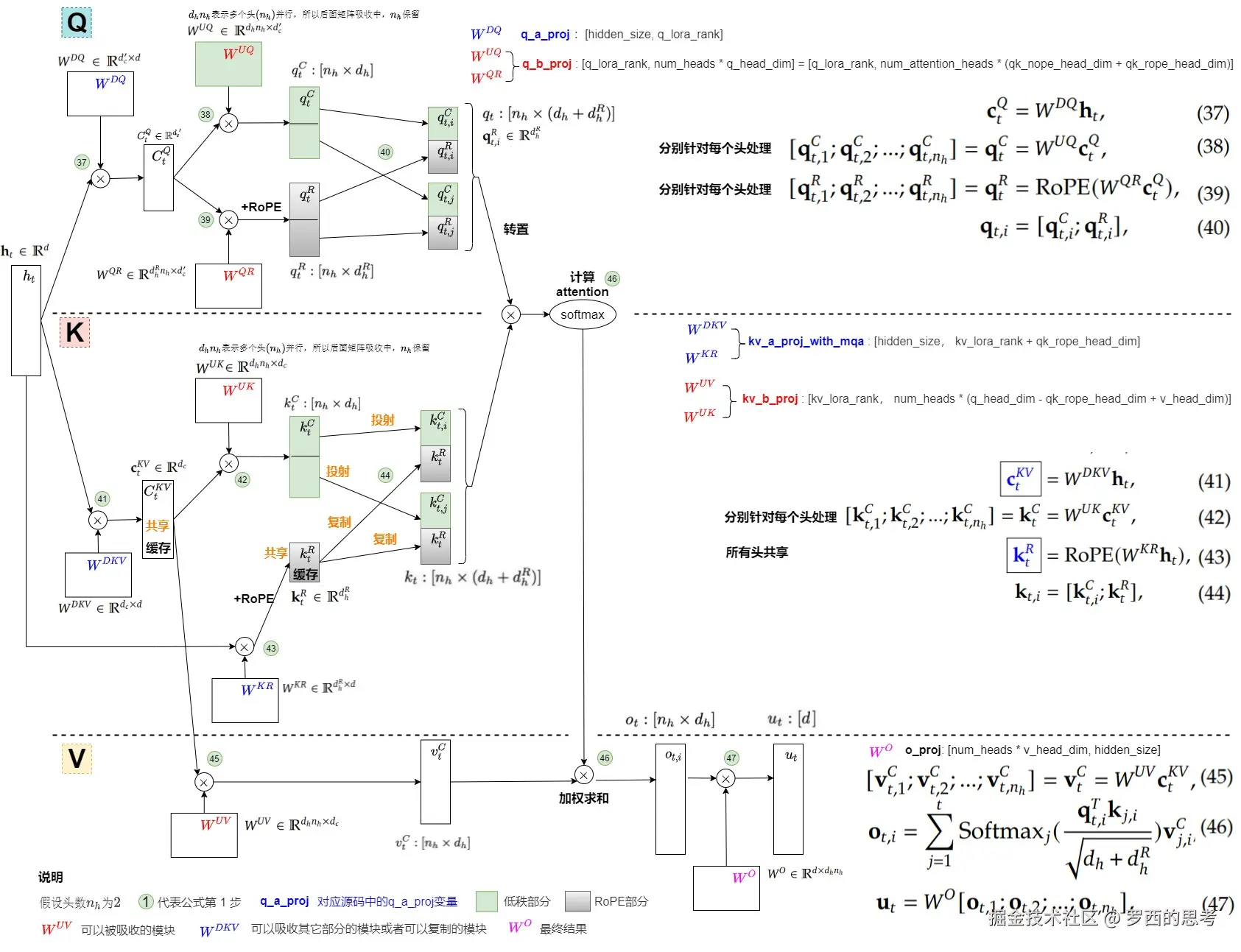 - 恢复信息:进行注意力计算时,进行注意力计算时,分别通过上投影矩阵和还原出键和值,此处对应图上标号42和45。每个注意力头上的键再与携带了RoPE信息的共享键向量拼接形成MHA的键值输入,此处对应图上标号44。通过上投影矩阵和升维还原并生成查询向量(对应图上标号38)和携带RoPE信息的查询向量(对应图上标号39),二者拼接形成MHA的查询向量输入,此处对应图上标号40。
