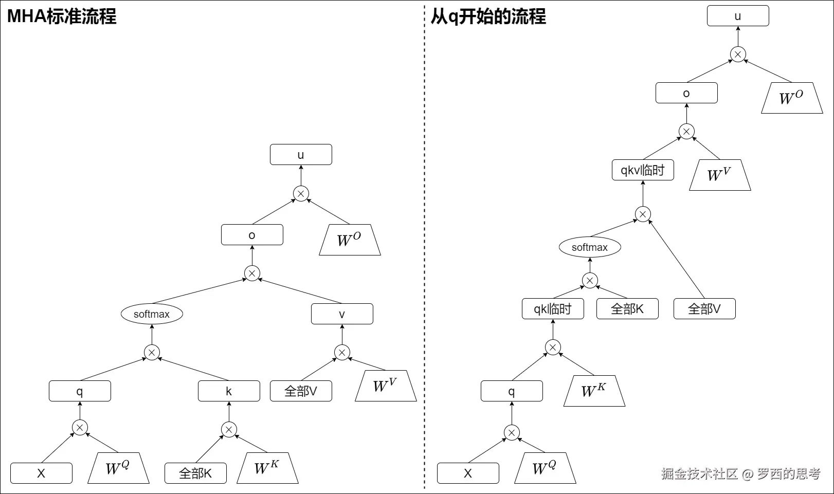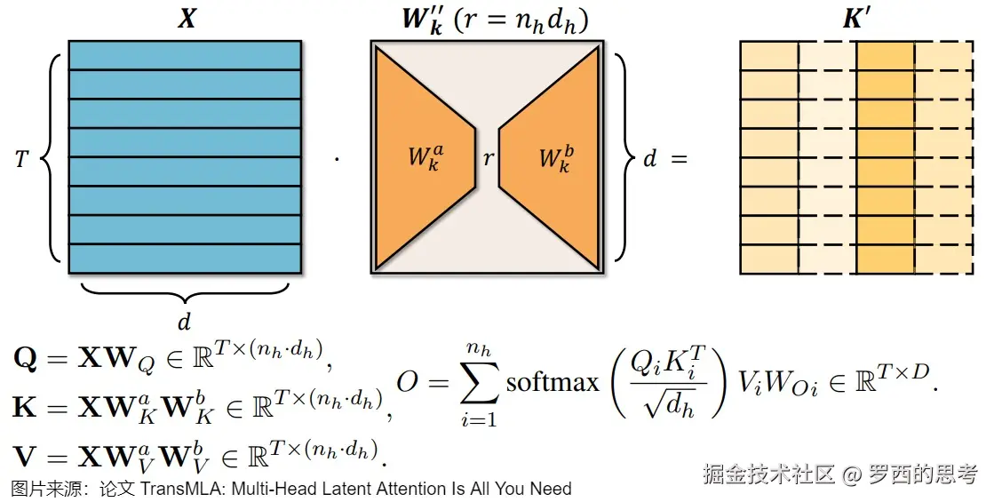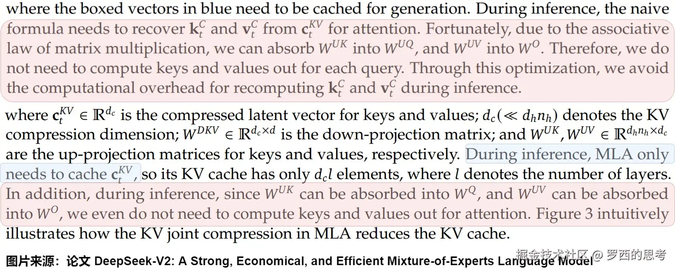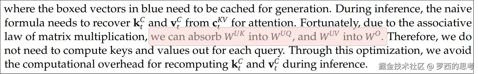 但这有一个问题,如果单纯的把一个大的K/V矩阵拆成2个小矩阵进行缓存,在推理的时候,还是需要计算出完整的K矩阵,这样就失去了缓存的意义,毕竟缓存的意义就是减少计算。