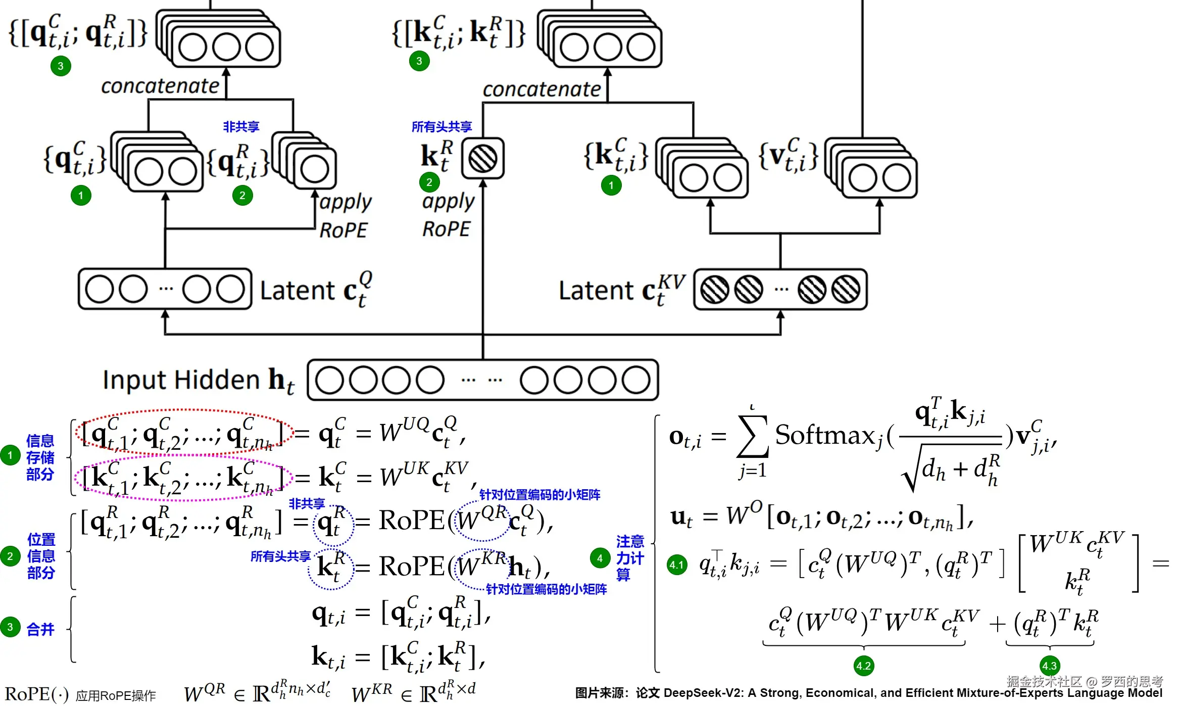 - 解耦RoPE策略:为提高模型对序列中上下文信息的敏感性,MLA中应用了解耦旋转位置编码(RoPE)技术。因RoPE与低秩KV压缩矩阵不兼容,故MLA引入额外的查询向量和共享键向量来携带RoPE信息,避免了RoPE与低秩压缩矩阵之间的耦合问题,解决了位置信息与推理效率之间的矛盾。此处大致对应图上标号39和标号43。