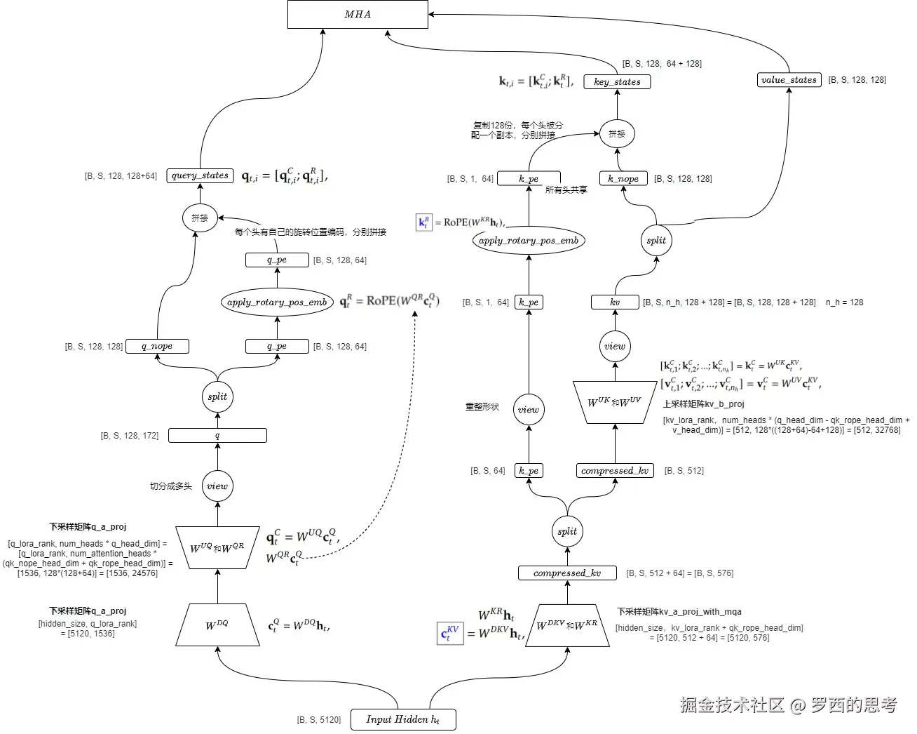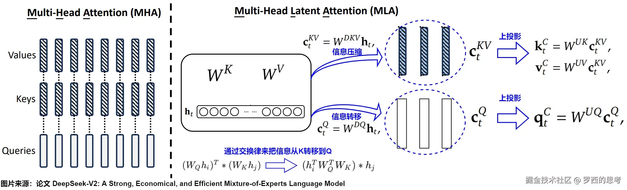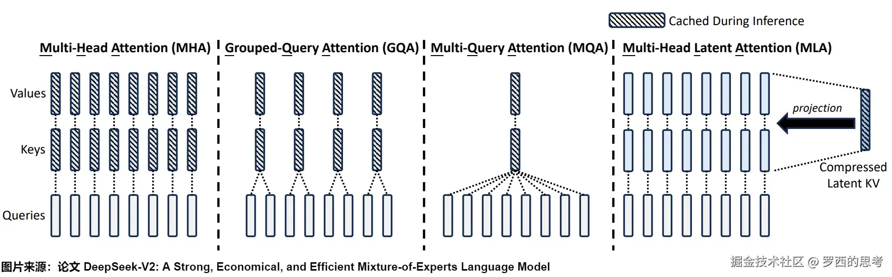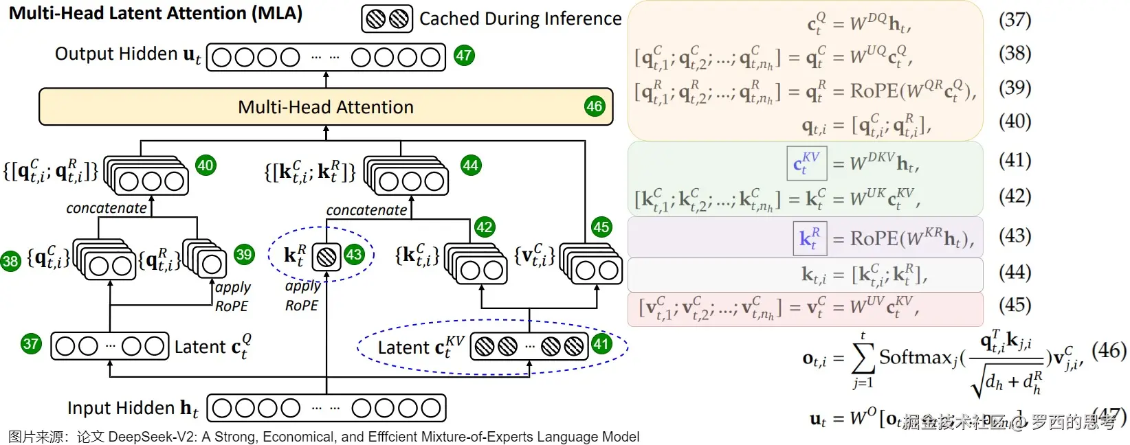 - 进行 MHA 计算。这样,MLA在推断过程中仅缓存潜向量,而不缓存完整的键KV。