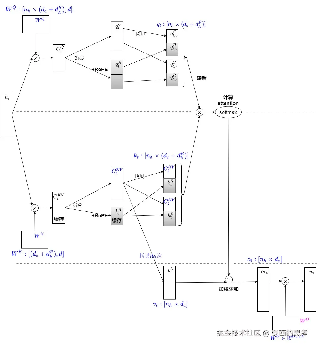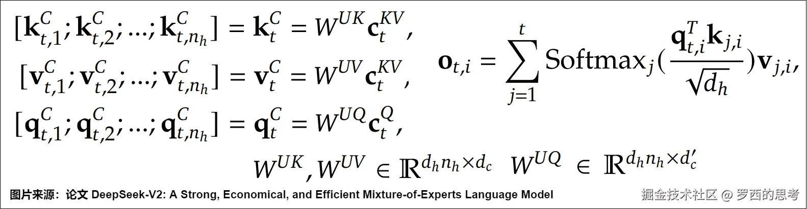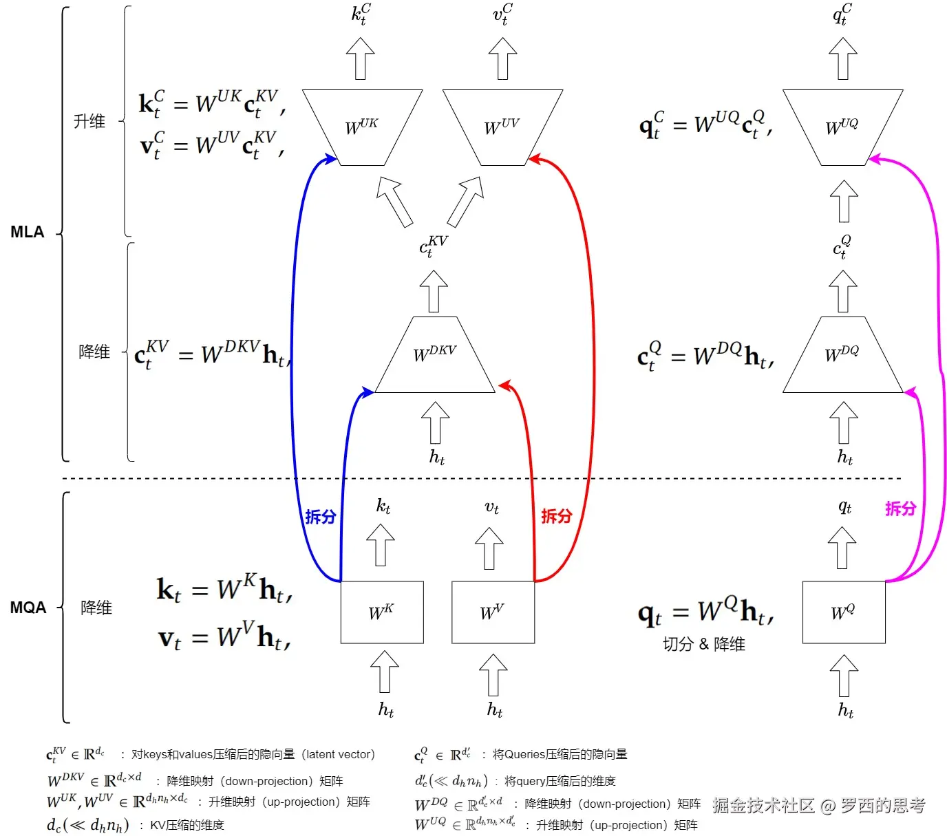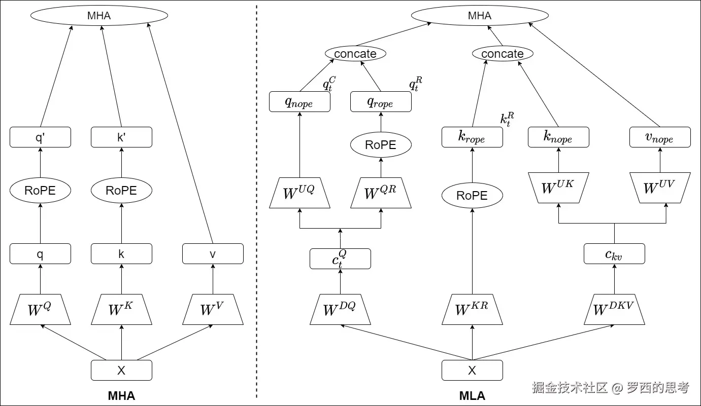 - 进行 MHA 计算。这样,MLA在推断过程中仅缓存潜向量,而不缓存完整的键KV。