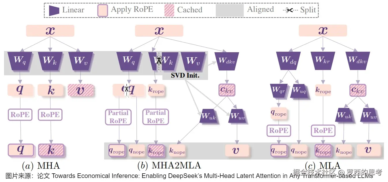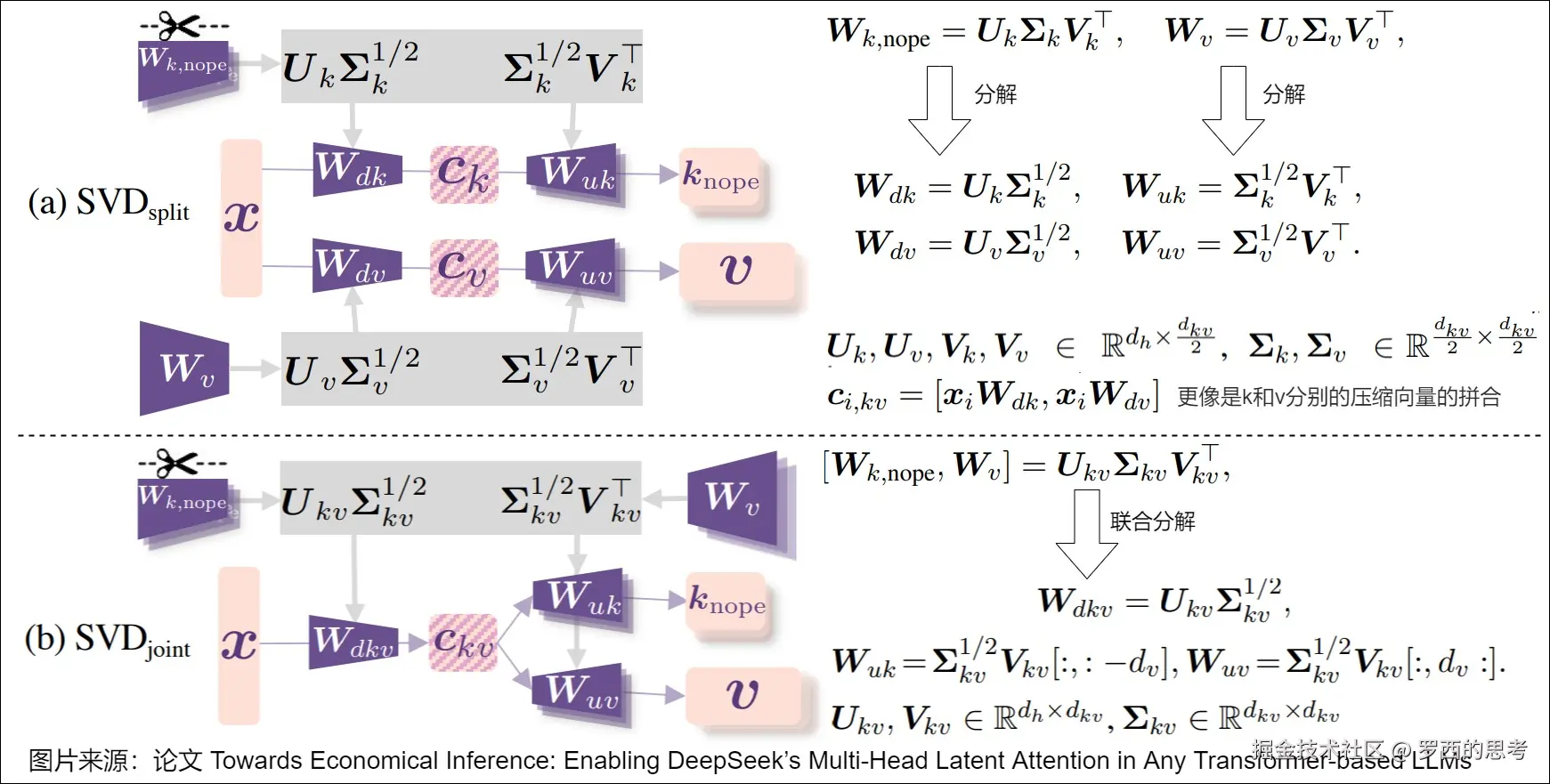 - 联合 SVD():为保留和V之间的交互,对连接矩阵进行联合分解。这种分解方式更加贴合MLA的标准格式。