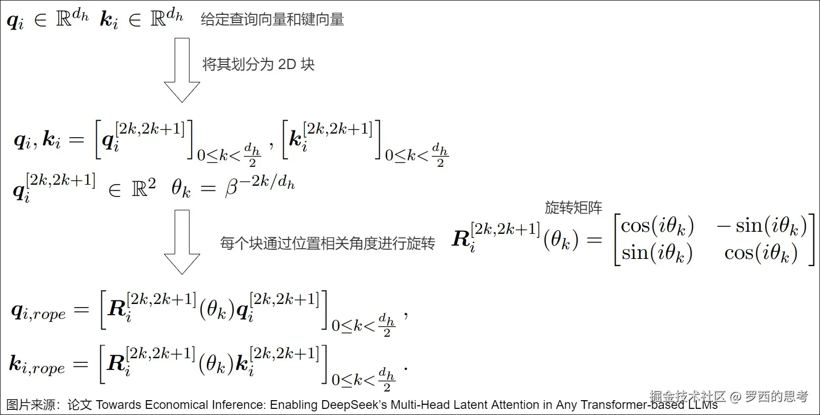 然而,压缩和RoPE位置编码是冲突的,即矩阵吸收后的没有了位置相关信息(原因:RoPE对key和query都是位置敏感的)。在这种情况下,只依靠来压缩KV-Cache的路是行不通的,所以需要额外的信息来表达qk之间位置关系。为了走出这个困境,DeepSeek提出了一种折中的方法:使用和两个矩阵来表征跟ROPE相关的特征提取,为q和k都增加一个额外的维度来添加ROPE编码,之前的维度不使用ROPE编码,总长度变为。即,MLA采用了MQA的思想,构造了所有head共享的cache变量和 ,这样才大幅降低了KV Cache。其中 是参数低秩分解中Down处理后Up处理前的低维向量,而 可视作是MQA版本的RoPE。