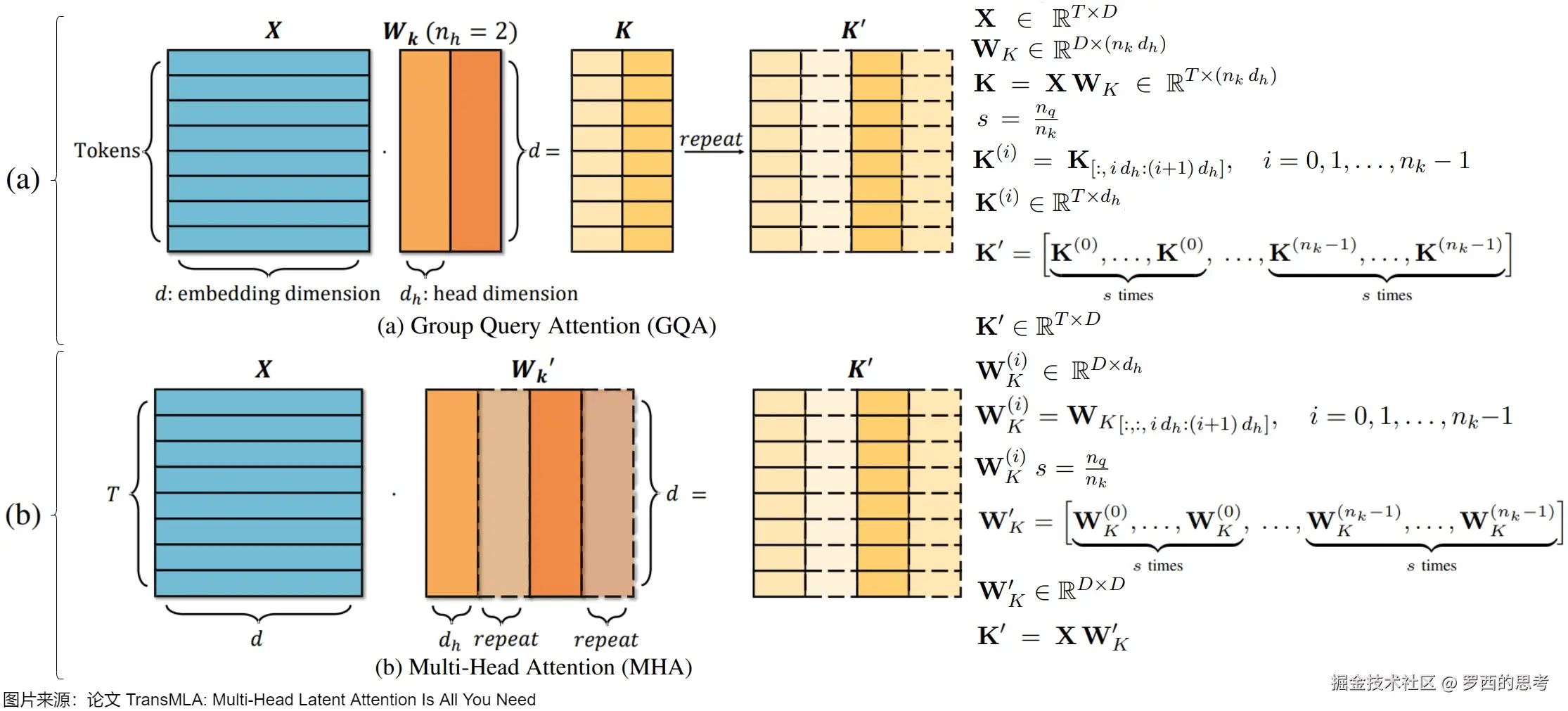 我们可以注意到,在MQA和GQA计算注意力时,只用到了简单的广播或者复制机制把KV头复制给对应的Q头进行计算。我们以GQA为例,GQA 目的是减少KV Cache占用,存储的是KV,即。下面公式是如何得到k(这里省略了v的操作)。