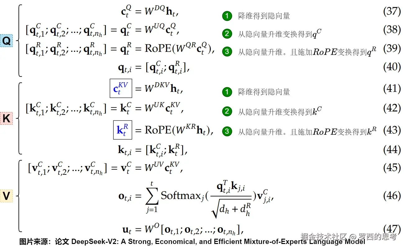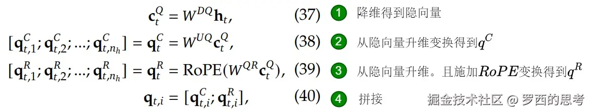 - 查询(Q)的降维压缩:输入序列中的 t 个Token()通过一个下投影矩阵压缩为压缩潜在向量(其维度远远小于输入Token的维度)。此处对应图上标号37。