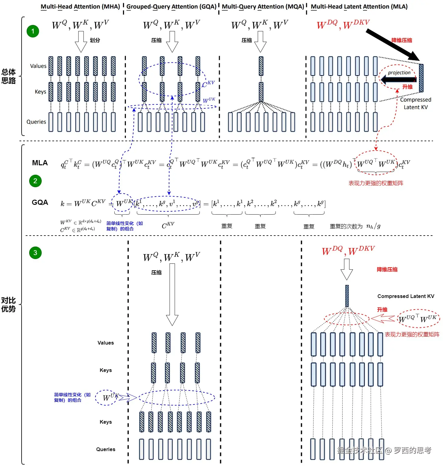 MLA是对MHA、GQA、MQA方案的改进,其思路是加强信息压缩能力(对应下图标号1)和丰富信息表达能力(对应下图上标号2),其实,两个标号也对应了从输入到Q、K、V的数据流上两个关键点,也是硬币的两面:增强了矩阵的表现能力的同时,也会使得压缩能力更大。