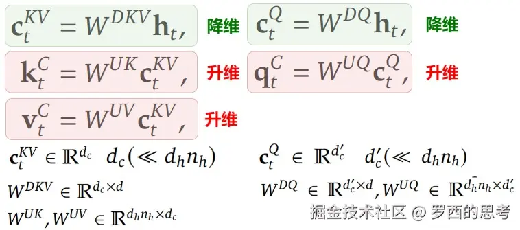 - 在进入标准MHA算法之前,用压缩的向量来替代之前更长的KV向量。之前是缓存K和V两个向量,现在只存储压缩后的一个向量。