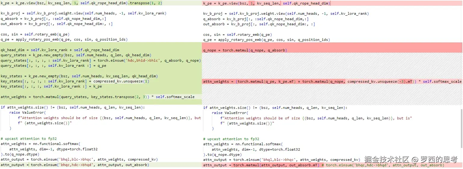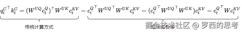- 另一方面,MLA解压缩后的多头注意力机制能够提供较高的计算强度(正比于 Head 数),有助于充分利用GPU的算力资源,缓解MQA、MGA对性能的损耗。MLA 通过低秩转换方式压缩 KVCache,从公式来看引入了额外的升秩转换计算,并且需要存储升秩转换计算的激活值结果。但可以根据矩阵乘的交换率特性,将升秩转换的矩阵乘权重和其他权重融合,然后在 attention kernel 直接完成 attention 计算,无需引入额外的计算开销以及存储开销。