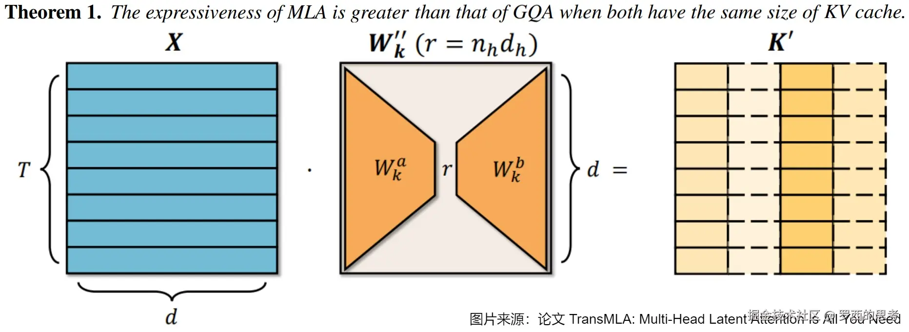 具体而言,MLA将KV矩阵转换为低秩形式:将原矩阵表示为两个较小矩阵(相当于潜向量)的乘积。具体而言,