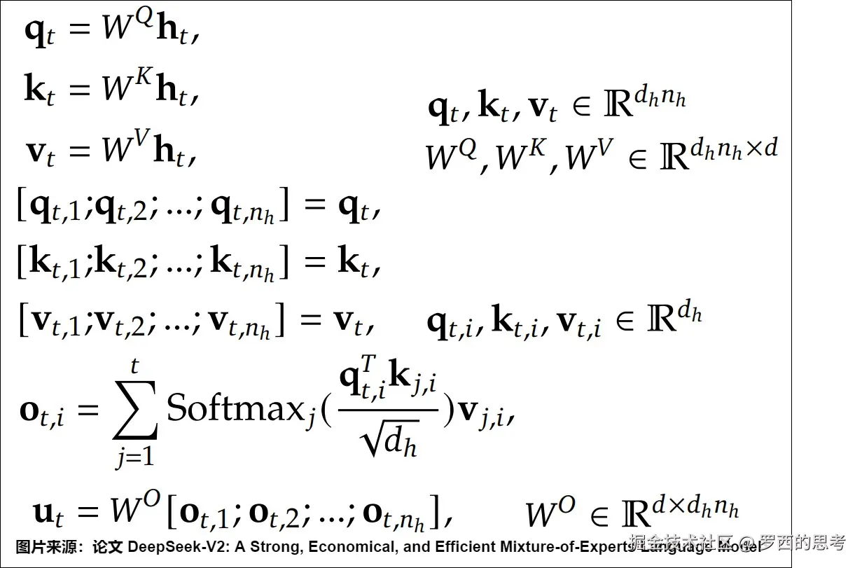 作为对比,下图给出了MHA的数学公式,对于每个token需要缓存个元素。如果是千问72B,则需要。在这里 ,, 都是用列向量表示。t是第t个token,j是迭代第1到t个token的序号,i是迭代head的序号。