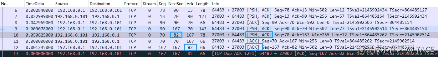 - No.12 为客户端对接收到的 No.10 数据包做出的 ACK 响应,ACK Num 为 82;