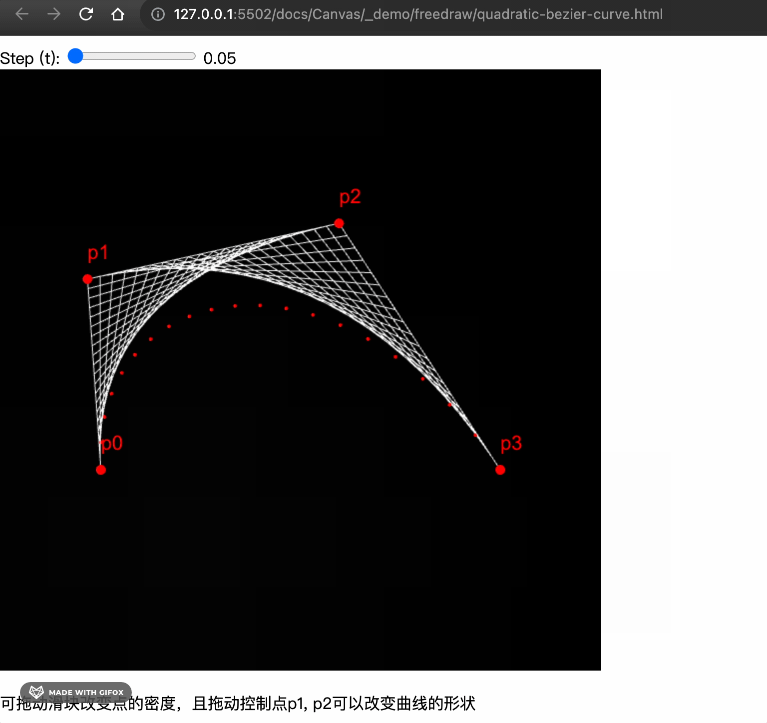 我们分别通过线性插值计算出 p0 和 p1 之间的点 B1,p1 和 p2 之间的点 B2,然后再计算出 B1 和 B2 之间的点 B。