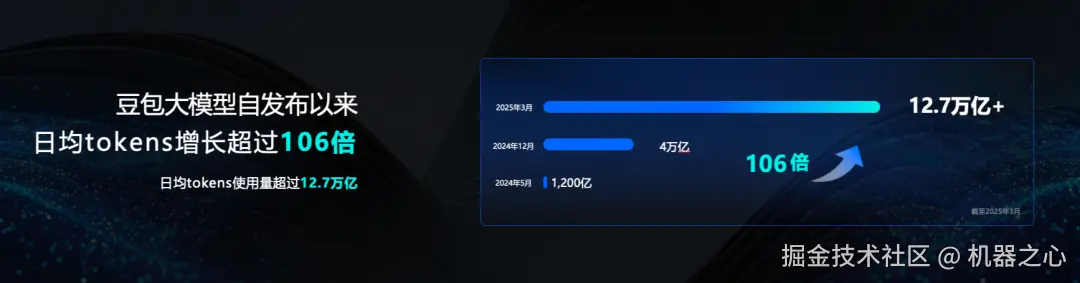 近一年来,不断增加的调用量和多场景覆盖,让豆包大模型家族持续壮大、越来越全面。去年 12 月,豆包大模型的日均 tokens 调用量达成 4 万亿里程碑。截至 2025 年 3 月底,这个数字已经超过了 12.7 万亿,相比刚发布时实现了超过 106 倍的超高速增长。