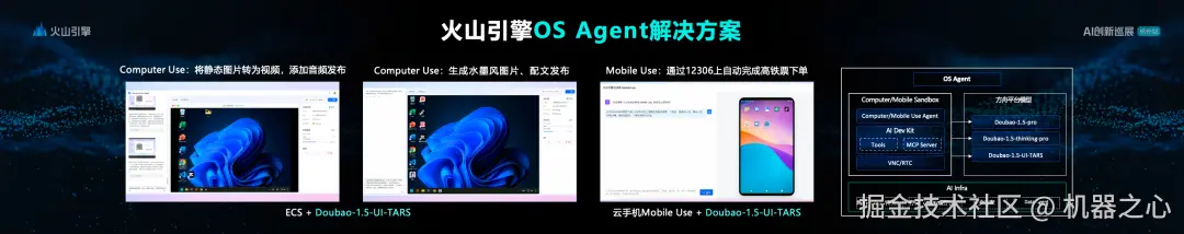 本次活动中,火山引擎面向 Agent 服务,发布了 OS Agent 解决方案、GUI Agent 大模型 —— 豆包 1.5 ・ UI-TARS 模型;面向大规模推理,发布了 AI 云原生・ ServingKit 推理套件。