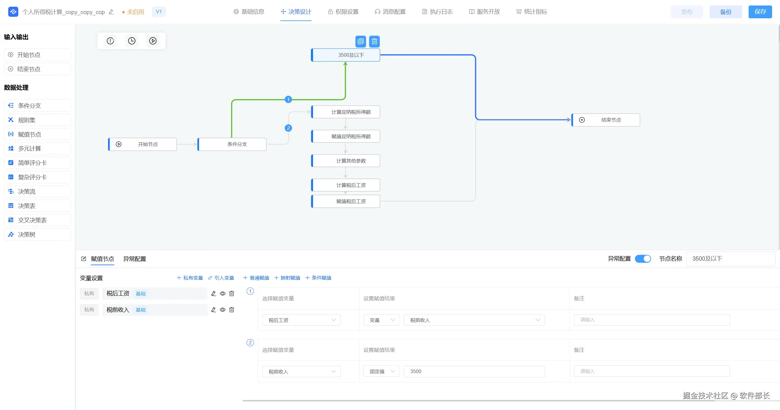 决策流是JVS规则引擎的核心执行框架,支持拖拽方式组合规则节点(如决策树、评分卡、多元计算、规则集、条件分支节点等),形成动态逻辑链路。