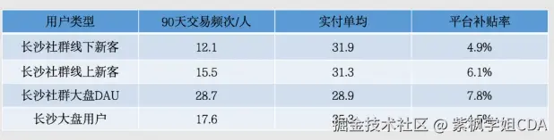 综合来看,与长沙社群活跃用户以及整体新客交易数据对比,本次线下拉新成功的用户具有以下特征:交易频次更低、实付客单更高、平台补贴率更低。