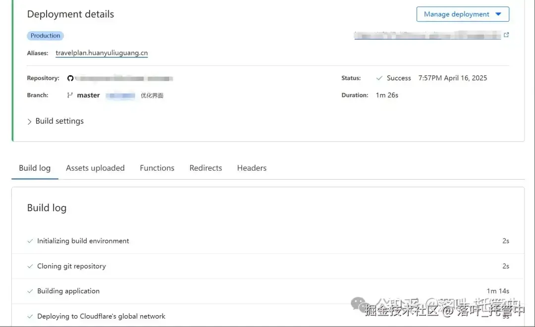 - Cloudflare自动完成构建和部署后,会生成一个.pages.dev的域名。