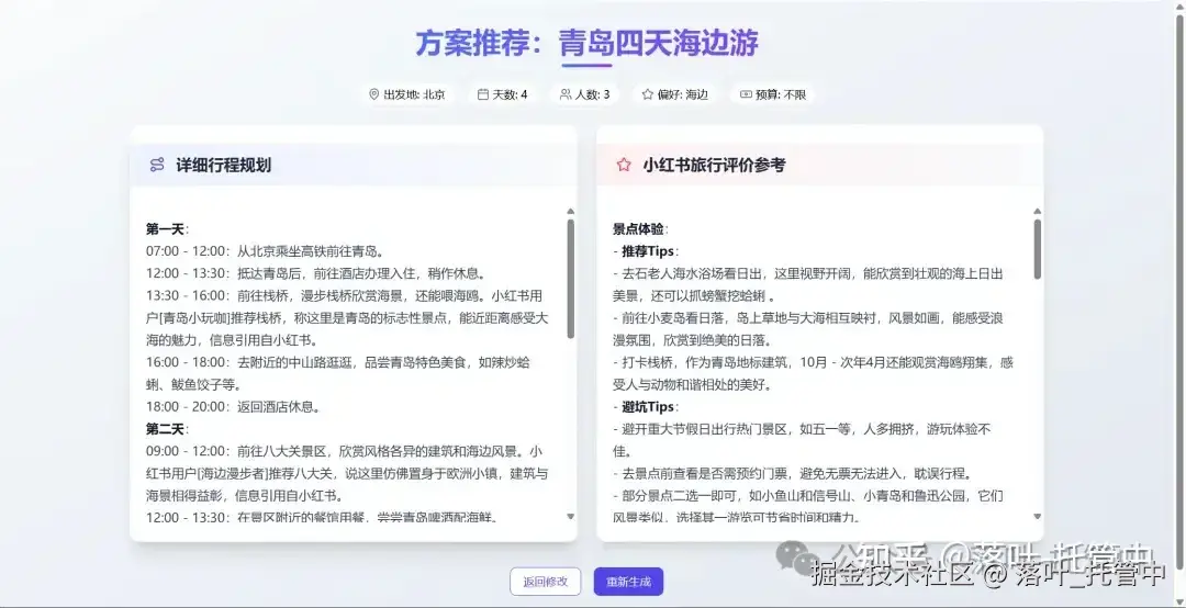 所以,我们决定给我们的 AI 旅行规划师加一个“杀手锏”:不仅给你推荐和规划,还能自动去小红书上扒拉相关的热门笔记和评论,然后用大模型给你总结提炼出精华参考! 让你在做决定前,就能看到过来人的“经验之谈”。