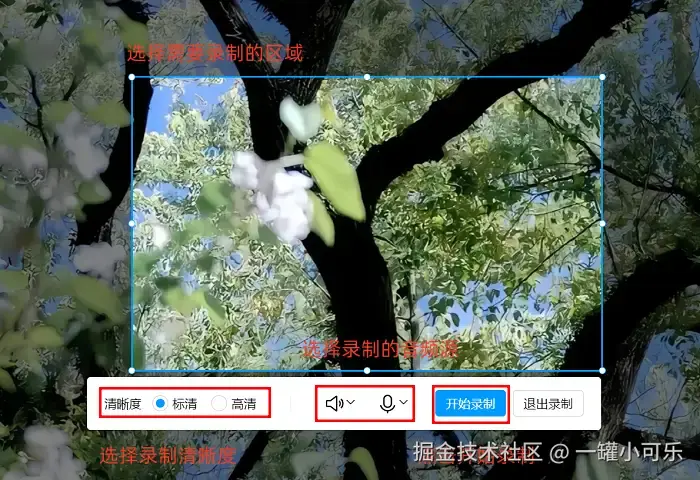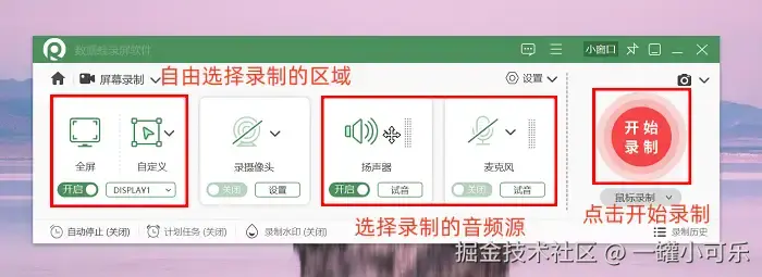 步骤2:选择录制区域与音频来源,然后点击 “开始录制” 按钮,就可以开始录制视频啦。