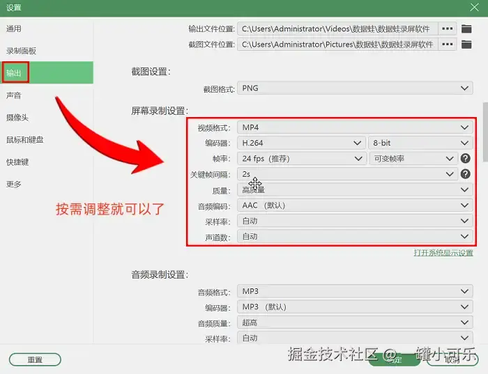 步骤2:紧接着,你需要确定想要录制的屏幕区域范围,同时选择好音频来源,确保声音的收录符合预期。要是你希望对视频的录制参数进行优化,如更改视频格式、调整清晰度等,只需要打开 “输出设置” ,就可以在该界面中完成这些参数的个性化调整。最后点击 “开始录制” 按钮就可以啦!
