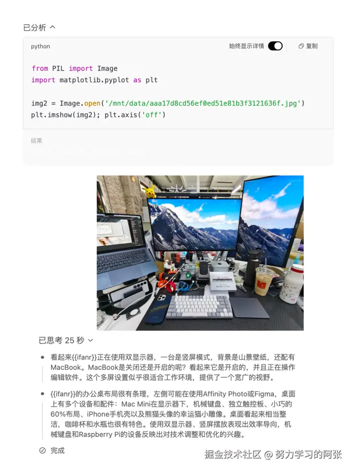 虽然题目答错了,不过能看出来 o3 的确如所承诺的那样,推理是基于图片素材进行的。