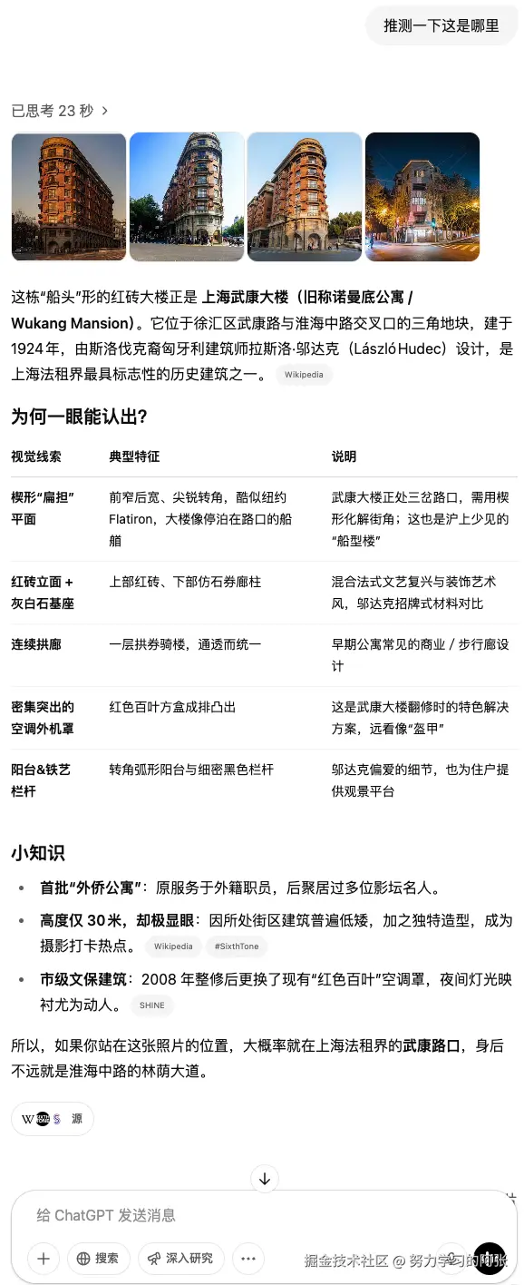 不过凌晨刚发布的时候,o3 可能没睡醒,一个简单的武康大楼认不出来。等到下午再测,「智力」就恢复了。
