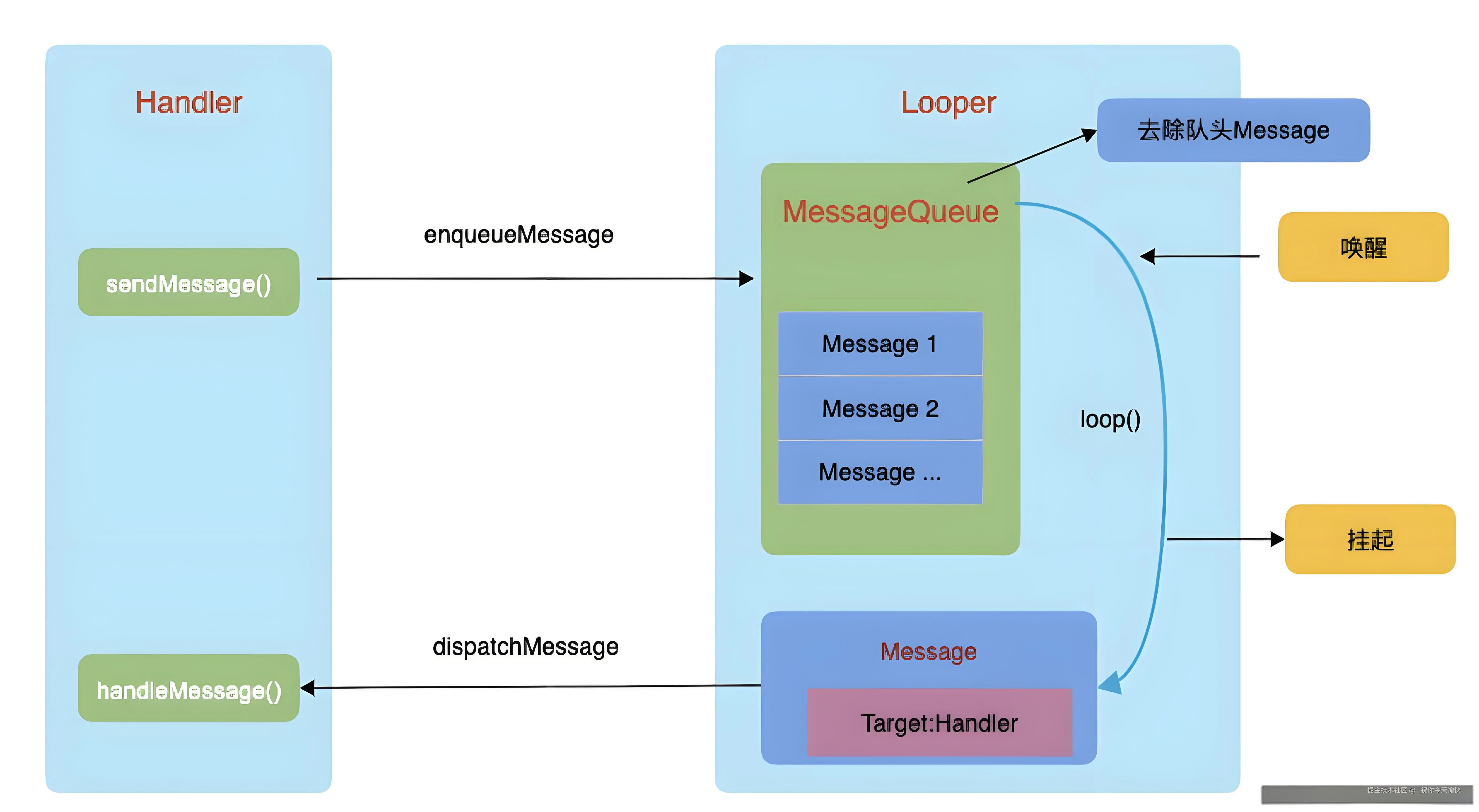 Message:封装消息的数据结构。MessageQueue:存储Message的队列,内部是单链表。Looper:负责循环读取MessageQueue并分发消息。Handler:对外提供sendMessage()、post()发送消息,并处理MessageQueue中的消息。