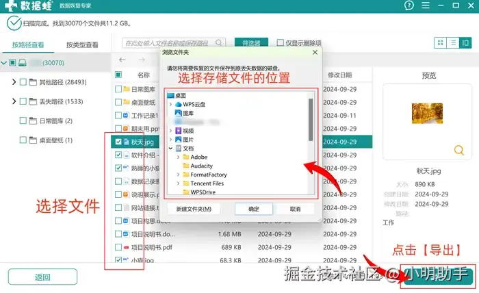 步骤2: 文件扫描结束后,选择目标文件后点击【导出】;但如果扫描出来的文件过多,可以选择使用【筛选器】,输入目标文件的相关信息,缩小搜索范围;