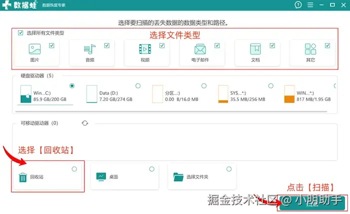 步骤1:在首页上勾选出需要找回的文件类型,再勾选右下角的【回收站】,选好后点击【扫描】;