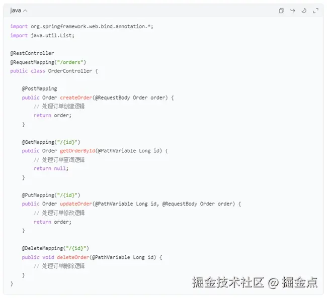 飞算JavaAI可以根据用户输入的业务需求,自动生成符合规范的RESTful API代码。例如,当用户指定需要实现订单的创建、查询、修改和删除功能时,飞算JavaAI会生成相应的Controller类,包含各个接口的处理方法。以下是一个简单的示例: