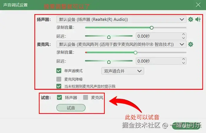 备注:在“声音输出设置”板块,可以对录制音量等参数进行个性化调整,还可以打开麦克风降噪等功能哦。