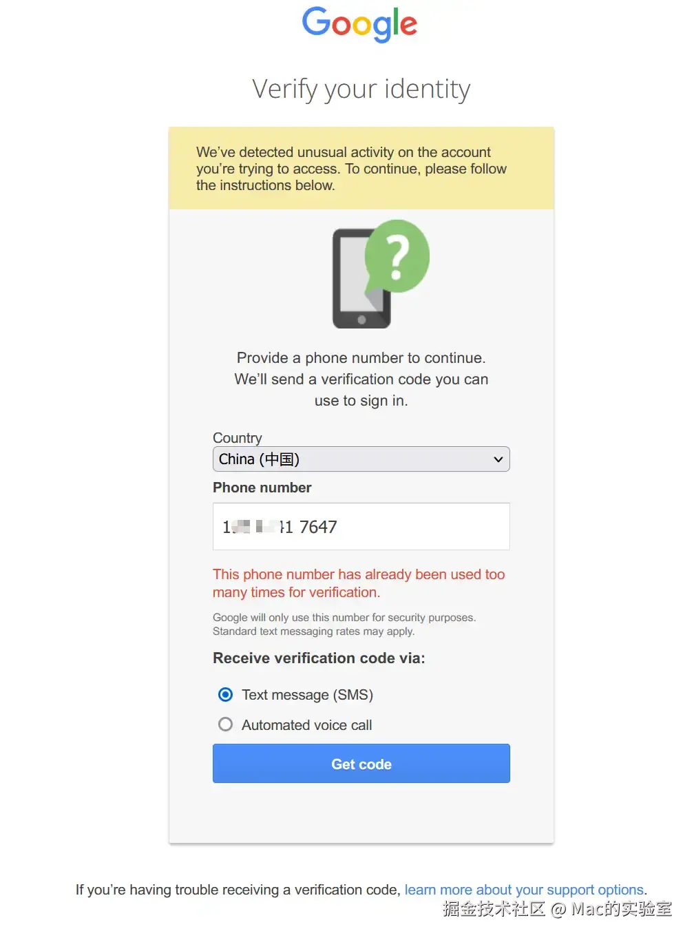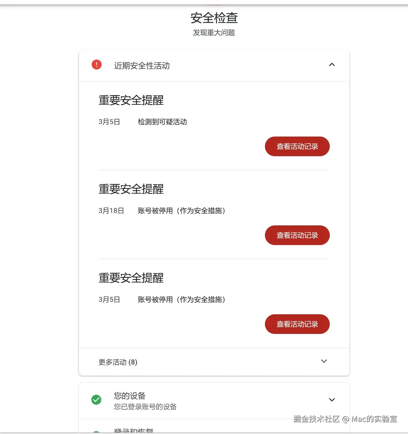 如上述谷歌后台活动显示那样,有多次可疑的登陆行为,谷歌会一直使用拦截工具阻止你登陆的,最后就会演变成谷歌账号彻底停用。所以不要多次尝试验证,觉得比较急账号比较重要的同学可以参进公众号:Mac的实验室 回复 异常验证 获取解决办法