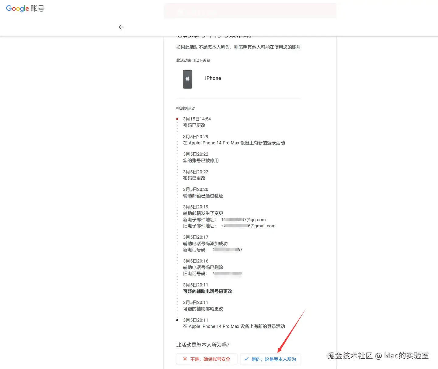 如图,出现频繁的修改安全设置,比如新的设备登陆活动、电话换绑、密码修改、辅助邮箱更换等等,很快就会触发安全锁定 ,因为你在动这些修改的同时,并没有在谷歌的安全活动记录里面确认这些账号行为是本人活动所为。