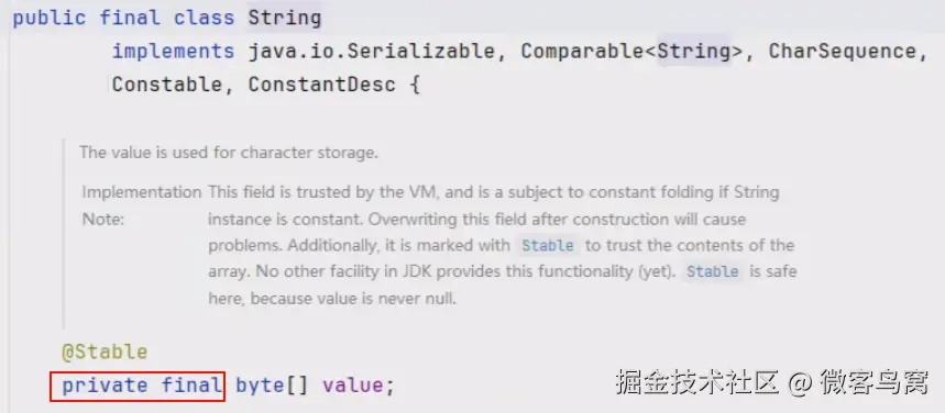 String的内部使用value数组来存储一组字符,JDK9之前是char[],JDK9之后byte[],它们都有final修饰。意味着这个数组不能修改地址,即不能扩容(因为扩容会创建新数组)。