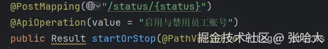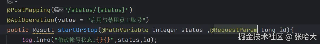 1 .路径传参:如:Localhost:8080/emp/1 ,就是写在了访问路径上而且用/分割的(1就可以看作一个参数,这个1的参数名为status),那么我们服务端想要接收这个参数,必须使用注解 @PathVariable("这里面写传过来的参数名(status呗) "),如果你接收参数的类型名称与参数名相同,那么可以直接写注解 @PathVariable,不写参数名了,但是你对应的Mapping注解的路径**必须这样写(假如你参数名为id , @Mapping("/访问路径/{参数名id}"))*