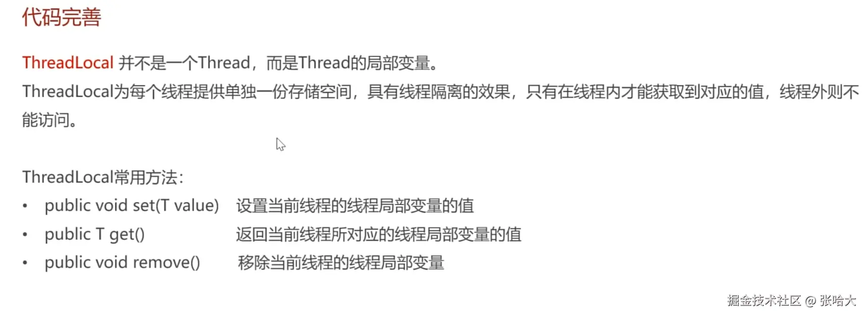 2.先了解一下它:执行一个任务时是不是有多个线程来执行(抢票是不是多个人同时抢),而ThreadLocal就是每个线程自己特有的空间,别的线程不能访问(下面是它的方法)