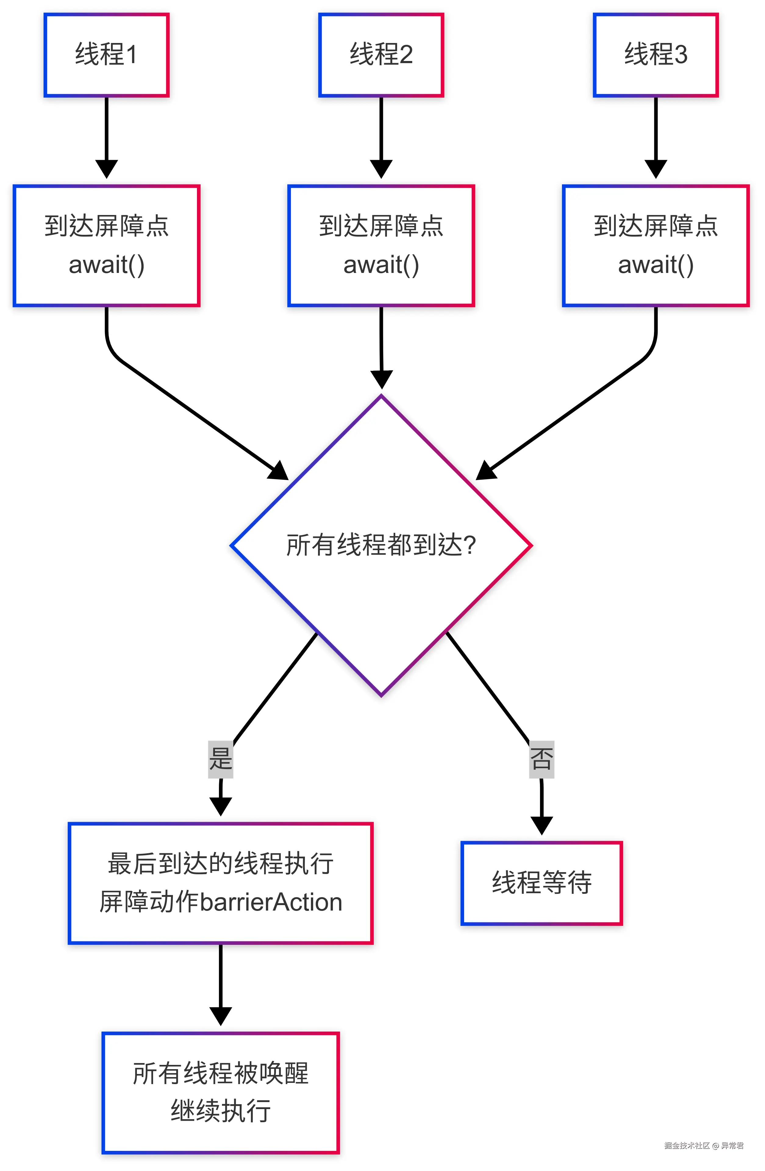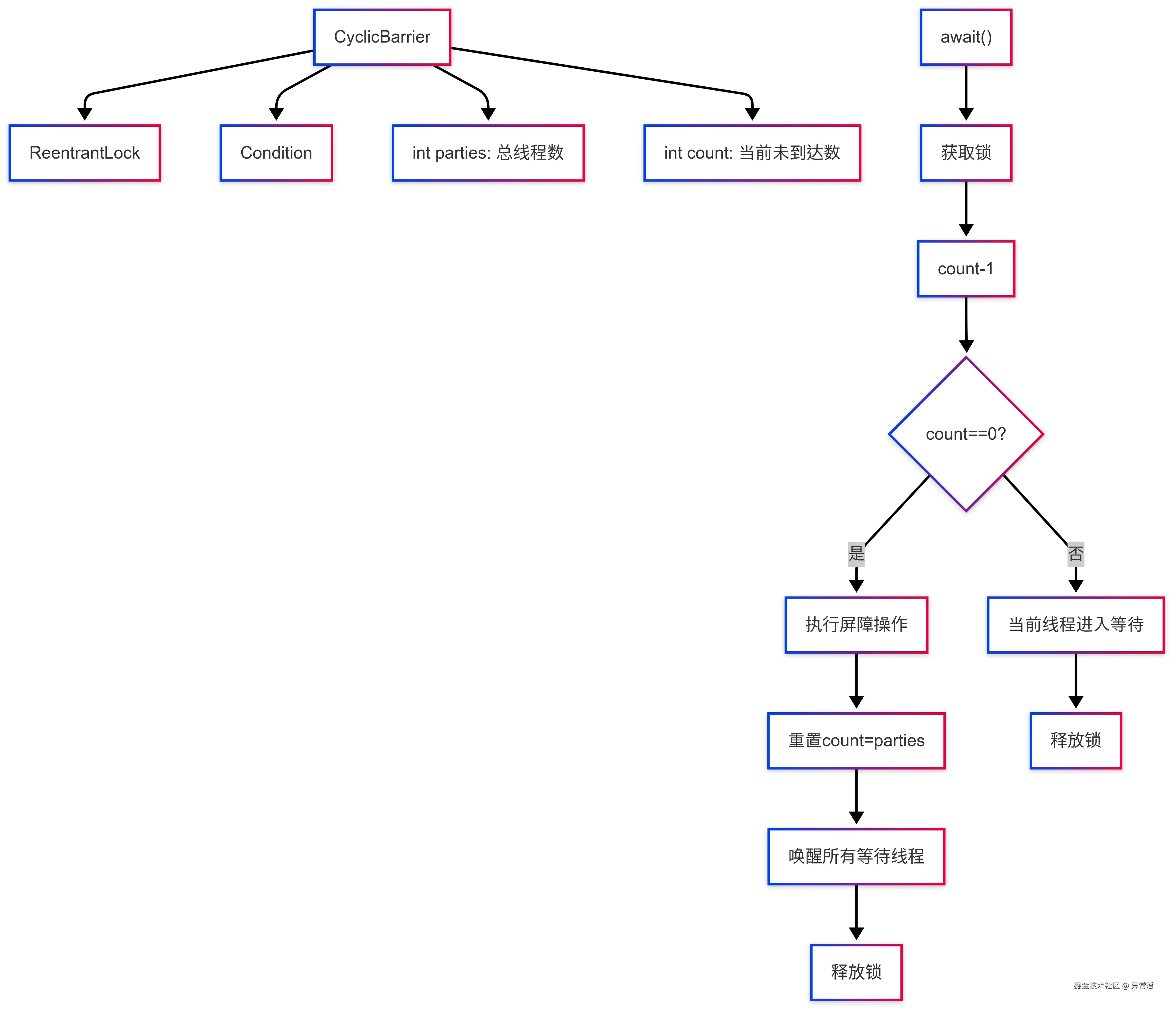 | CyclicBarrier | 让一组线程互相等待,到达同步点后一起继续 | await() reset() | 多阶段计算 并行迭代算法 分治算法同步 | 可重复使用 处理屏障破坏 线程数必须匹配 |