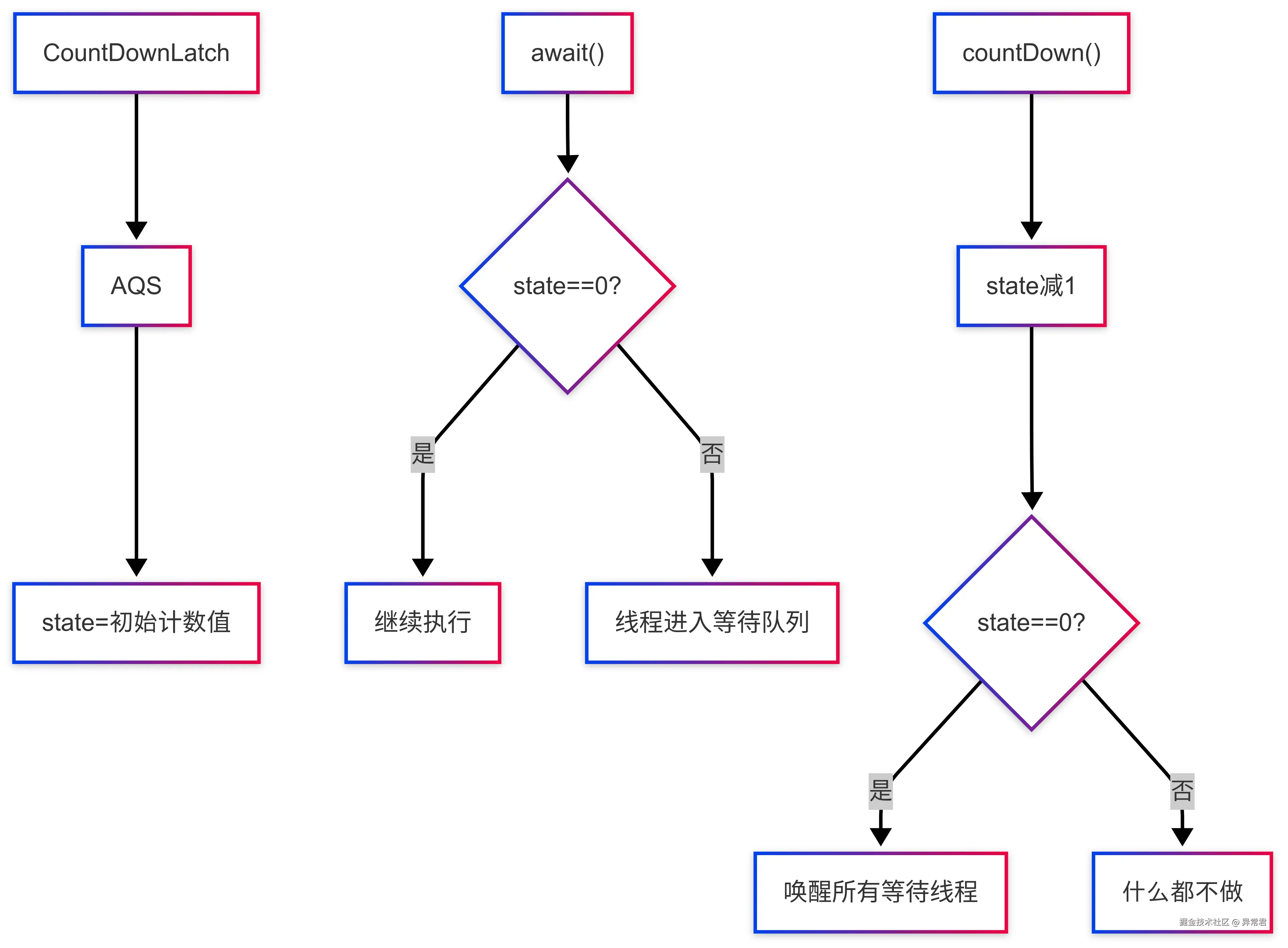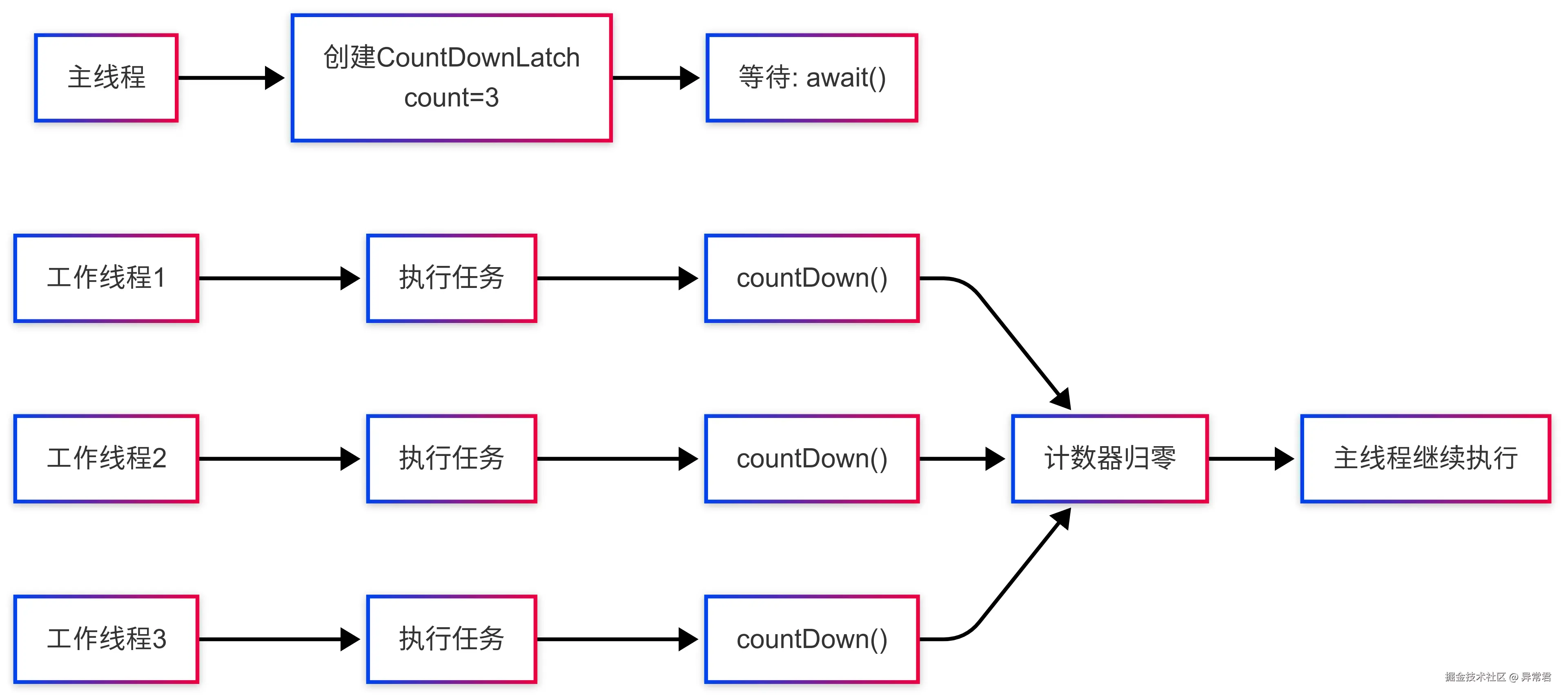 countDown() - 当计数器归零后,主线程从 await()方法返回,继续执行后续逻辑