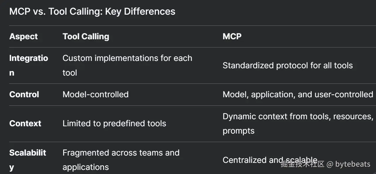 另一方面,MCP为AI应用引入了一个标准化接口, 用于与工具, 提示和资源进行交互. 下面是它的不同之处: