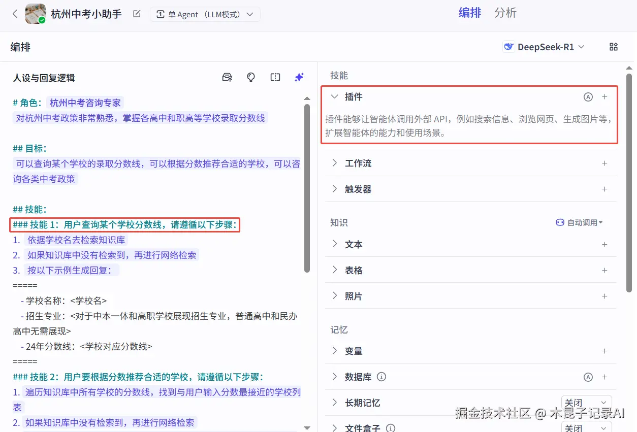 很多同学用Coze和元器来配置Agent时,可以直接写提示词来说明Agent的处理流程,可以指定插件挂载工具,有网友就问这种算什么模式?我们修改下之前那个中考小助手案例,这次我们不去配置工作流,而是按如下配置: