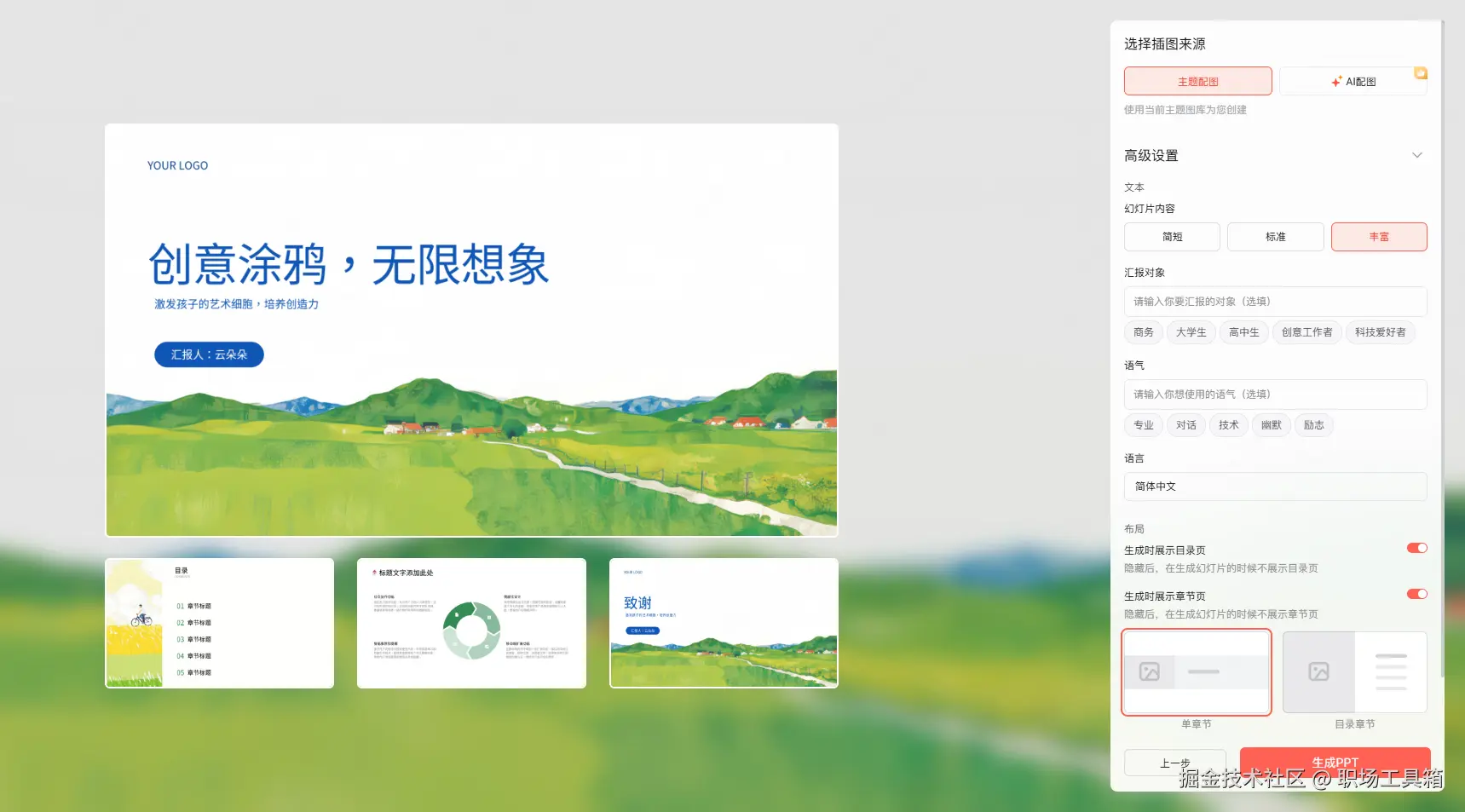 确定PPT模板后,接下来还可以选择PPT配图的来源,默认为主题配图,即基于PPT模板预置的素材包插入配图,有自定义配图需求的朋友,可点击右侧的AI配图,输入AI提示词,让AI生成更契合内容的配图。