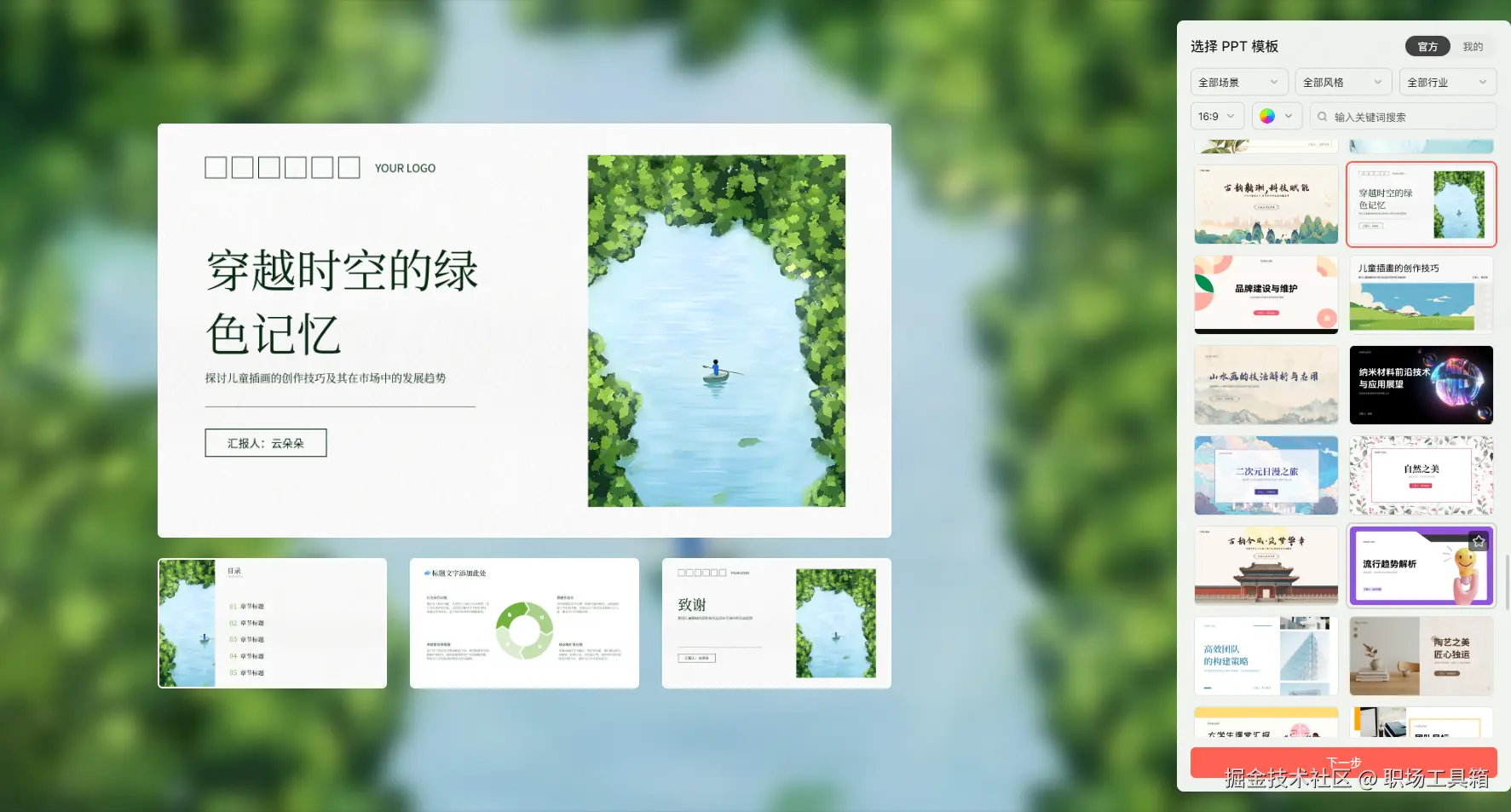 从右侧的PPT模板库中,选择一个符合PPT主题、使用场景的PPT模板。PPT模板库预置的模板数量超过300+,可点击上方的场景、风格、行业、色系按钮组合筛选,快速找到符合需求的PPT模板。
