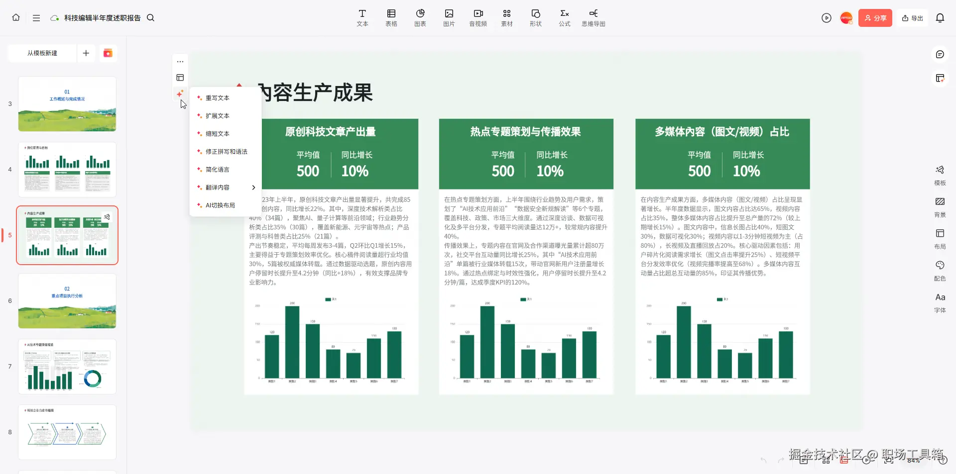 博思AIPPT一键生成的演示文稿如下,将鼠标指针置于左侧的导航窗口,可自上而下查看所有页面,博思AIPPT不仅支持一键生成PPT,而且提供了功能全面的在线PPT编辑器,支持再次调用AI优化PPT内容,包括重写文本、扩展文本、缩短文本、简化语言、翻译内容等,让最终呈现的PPT尽善尽美!