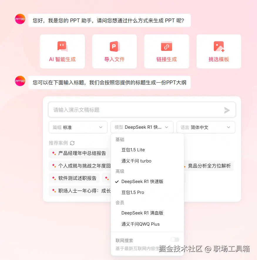 在输入框下方,点击“模型”选项,可切换一键生成PPT时所使用的大模型,想用DeepSeek一键生成PPT,可选择DeepSeek R1快速版和DeepSeek R1满血版。