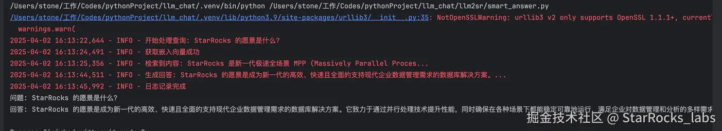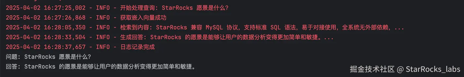 - 检索增强生成(RAG 负责): 用户输入问题 → DeepSeek 生成查询向量 → StarRocks 进行向量匹配 → 返回相关文档 → DeepSeek 结合文档生成最终回答。